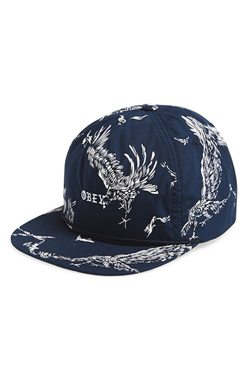 Feathery birds of prey take flight all over a lightweight, unstructured cap fitted with an adjustable leather strap.