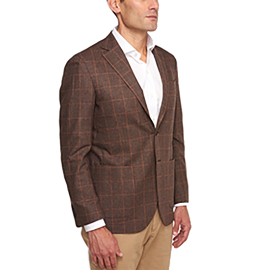 This unlined, wool blend sport coat from Ledbury is brown with an orange box check. Incredibly lightweight, The Light Brown Ayers Sport Coat is the perfect weight for layering over a dress shirt in mild to cool temperatures. Features two patch pockets, a single breast pocket, and two back vents.