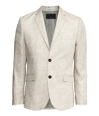 This slim fit linen blazer from H&M is perfect as an inexpensive entry to the linen blazer world. It features a chest pocket, pockets with flaps, three inner pockets, vent at back, and decorative buttons at cuffs.