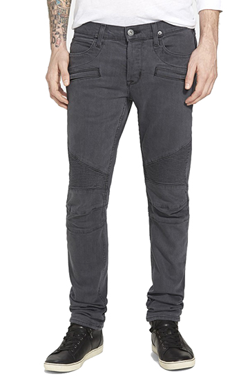 Crafted in America from black, raw denim, Hudson's Blinder Skinny Fit Motos feature stitch-panel reinforced knees and a pair of front zip-welt pockets.
