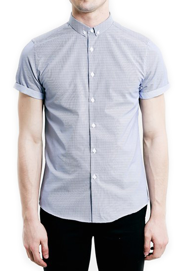 A small-scale button-down collar smartens Topman’s slim, tailored shirt, patterned with lean and lustrous stripes.